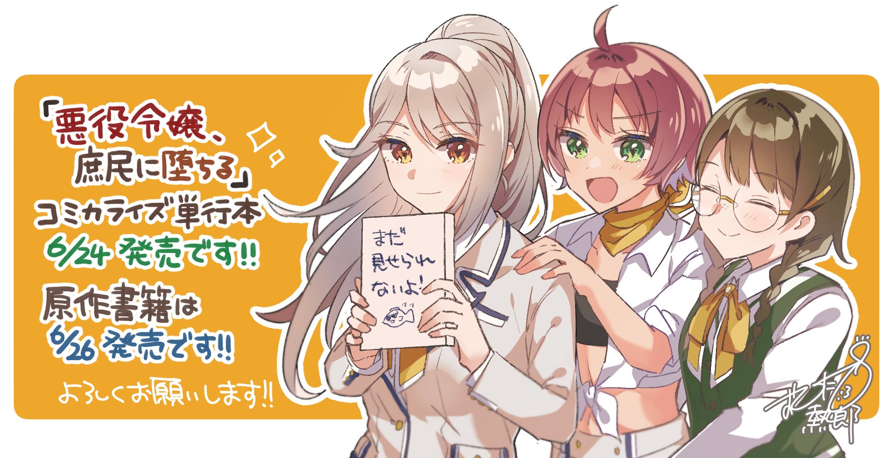 悪役令嬢、庶民に堕ちるのコミック及び書籍の発売日決定! 年 05月05日 (火) 16 コミカライズ五話で告知されましたので、こちらでも告知させていただきます。 年6月24日にコミックス発売予定。 年6月26日に書籍発売予定となりました。 悪役令嬢、庶民に堕ちるのコミック及び書籍の発売日決定! コミカライズのイラスト公開します! 悪役令嬢、庶民に堕ちるがコミカライズ決定! ただの落書きです。 悪役令嬢、庶民に堕ちる 緋月紫砲 おひたし熱郎 切符 ーーーーーーーー 琴音とその仲間たちのキャッキャウフフな展開が見れる番外編! 外見完璧な琴音がいいおもちゃにされてます^^* コミックス最終2巻は21年1月22日発売です!(担) ーーーーーー